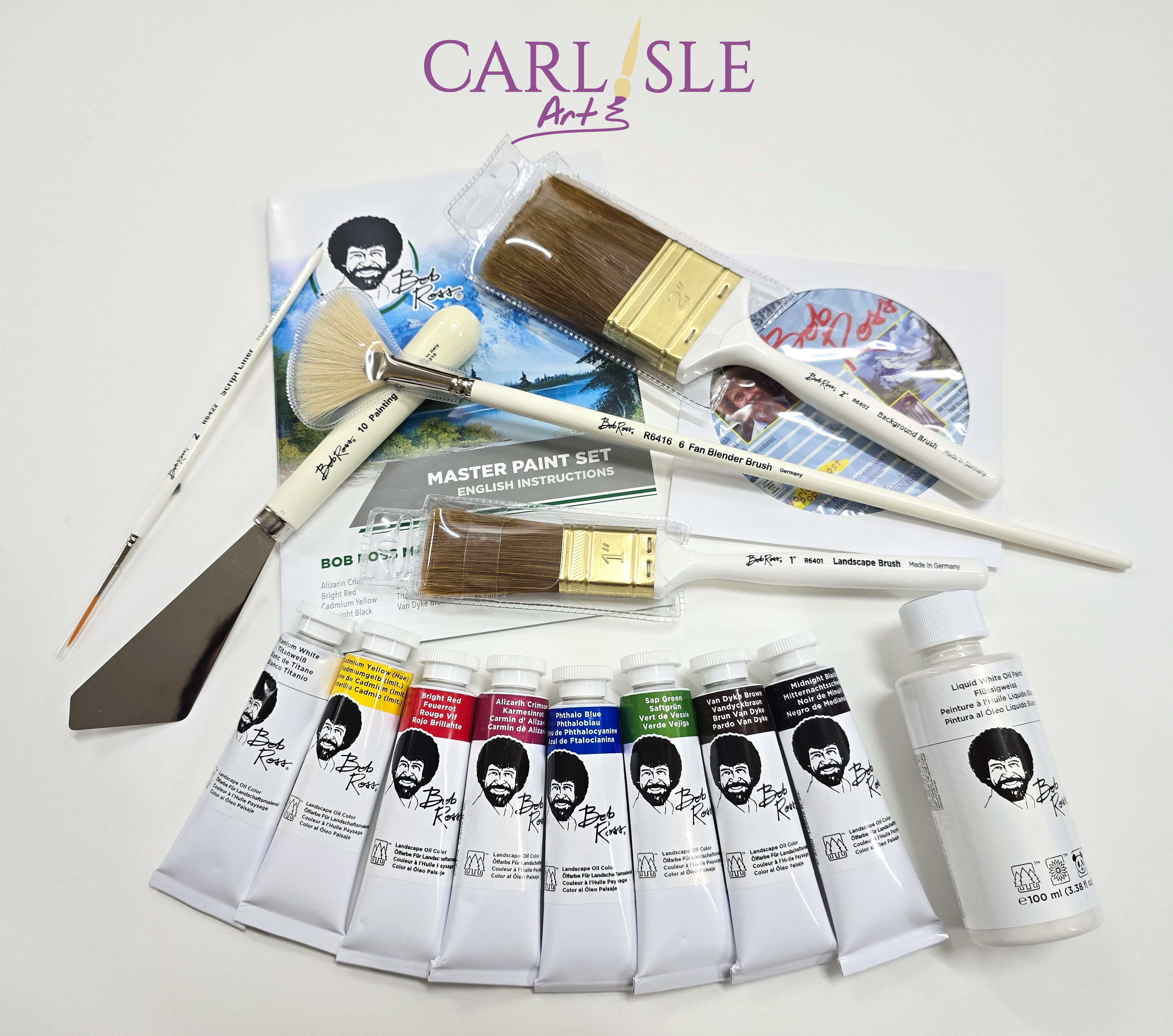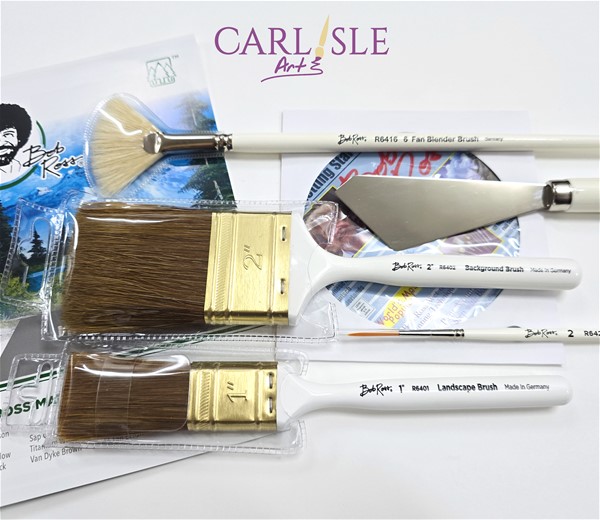 It contains 8 Bob Ross Oil Colours (37ml each), 1 tube of Bob Ross Liquid White (118ml), 1 Bob Ross #10 Landscape Knife, 1 1" Bob Ross Landscape Brush, 1 2" Bob Ross Background Brush, 1 #6 Bob Ross Fan Brush, and 1 #2 Bob Ross Script Liner Brush.