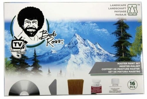 Bob Ross Master Paint Kit contains the following: 8 Bob Ross Oil Paints: Bright Red, Phthalo Blue, Midnight Black, Alizarin Crimson, Cadmium Yellow, Van Dyke Brown, Titanium White, Sap Green (1.25 oz. each), 1" Brush, 2" Brush, Large Fan Brush, Liner Brush, Large Painting Knife, Liquid White, PLUS!... a 12" x 16" canvas, the Bob Ross Clear Plastic Palette, 32 oz.