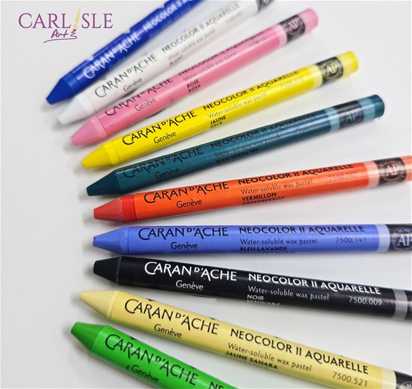 Neocolor II Crayons are softer than coloured pencils, denser than children’s wax crayons, and extremely responsive to a wet brush. Wet and dry techniques can be combined in the same drawing. Because of their strong pigmentation, light colours cover dark colours and vice-versa.