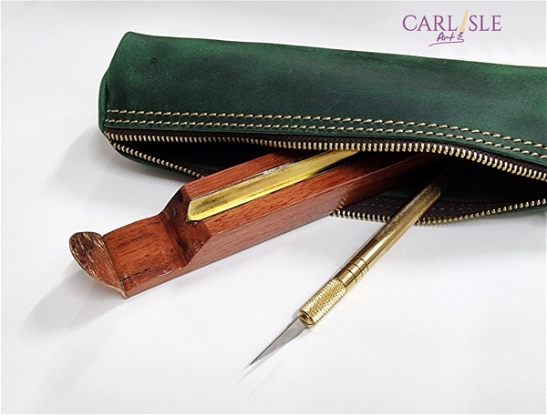 Handmade with aged wood and brass, pencil sharpening sleds are a one of a kind tool. Use by laying your pencil within the brass slide, press the leaded end against the brass tongue and use a craft knife to cut your pencils edge to satisfactory. Packaged with a brass craft knife and zippered carry bag