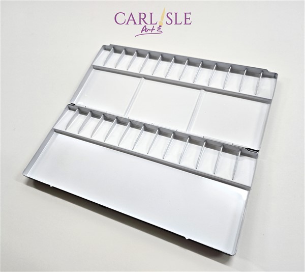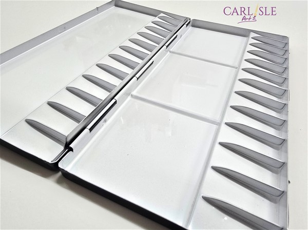 Holbein light-weight aluminium palette with a black and white enamel finish. The 26 slants and 4 wells provide an adequate area for storing and mixing watercolours. Thumb slot allows for comfort holding and painting ease.