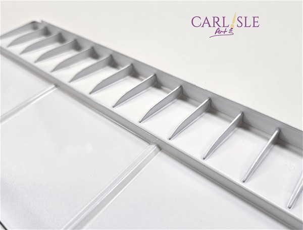 The Holbein range of aluminium palettes come in variety of different shapes and styles. The 40 has 13 slants and 3 flat wells along with a large mixing area. Approximately 25cm in length,22cm wide and about 2cm high.