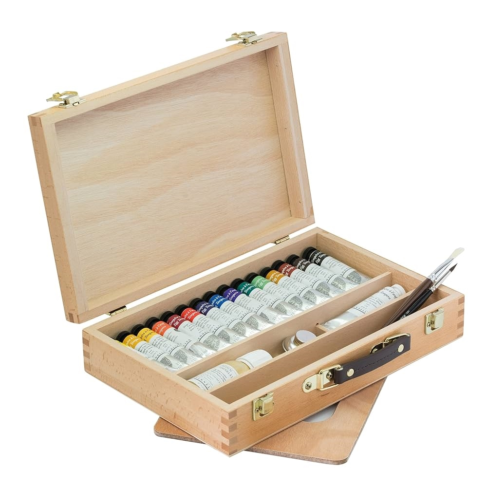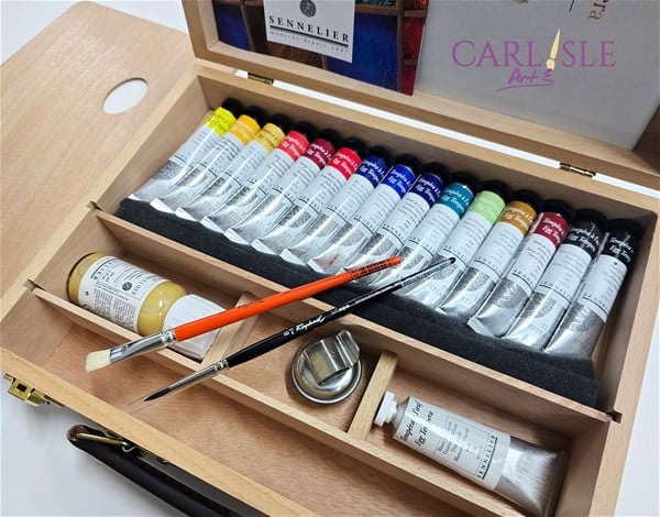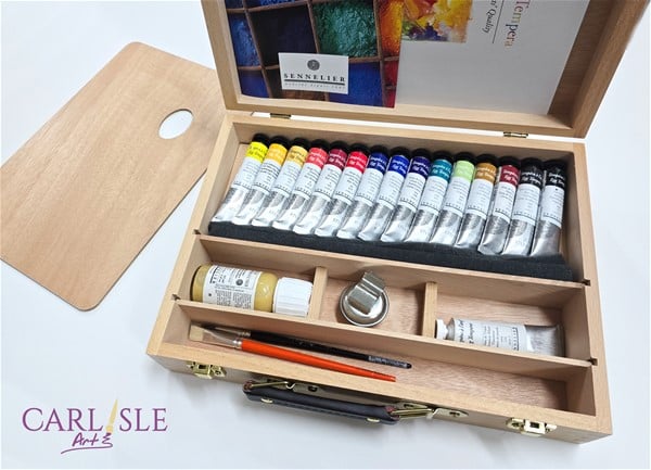 A set of fifteen 21ml tubes of Sennelier's world-famous egg tempera colours, plus a 34ml tube of titanium white, a 60ml jar of egg tempera medium, a stainless steel dipper and a wooden palette. A perfect set of everything an aspiring tempera painter could need!