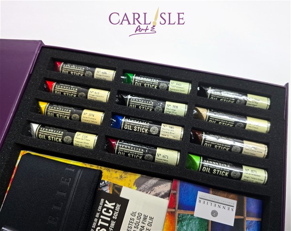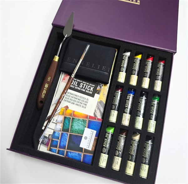 This elegant magnetic box contains 12 artist-quality mini solid Oil Sticks by Sennelier. It also includes a 240gsm oil painting paper pad with 15 sheets (10 x 22.8 cm), acid-free, a Precision round brush 8504, a painting knife, and a Sennelier cloth. The included colours are: 116, 574, 675, 686, 671, 385, 308, 845, 871, 202, 705, and 759.